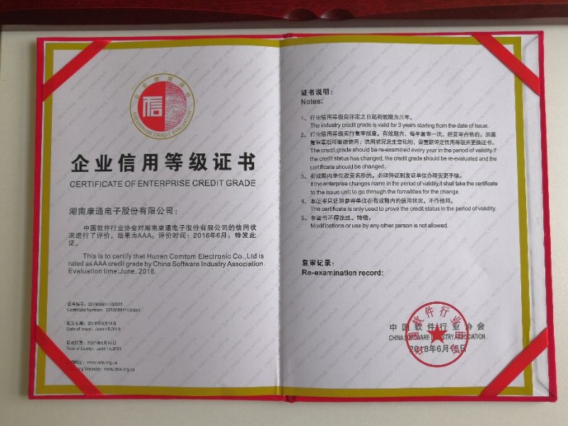 2018年6月,在工業(yè)和信息化部的業(yè)務(wù)指導(dǎo)下,根據(jù)中國(guó)軟件行業(yè)協(xié)會(huì)《中國(guó)軟件服務(wù)業(yè)企業(yè)信用評(píng)價(jià)管理辦法》,經(jīng)過企業(yè)申報(bào)、資料審核、專家評(píng)審等過程,中國(guó)軟件行業(yè)協(xié)會(huì)公示了2018年(第十四批次)中國(guó)軟件和信息服務(wù)業(yè)信用評(píng)價(jià)等級(jí)的企業(yè)名單,湖南康通電子股份有限公司獲評(píng)企業(yè)信用評(píng)價(jià)AAA級(jí)資質(zhì)認(rèn)證。