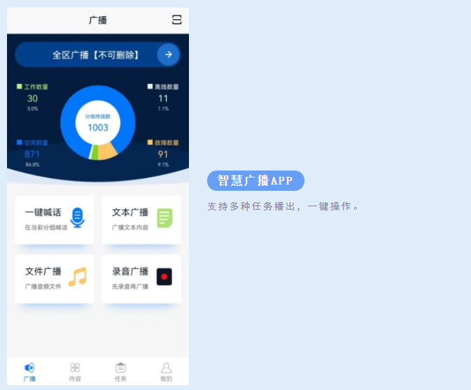 智慧廣播系統由智慧廣播云平臺、傳輸網絡和智慧廣播前端、終端組成,通過4G或IP網絡傳輸信號,具有安裝快捷,系統穩定,使用方便,秒級發布等特點。
