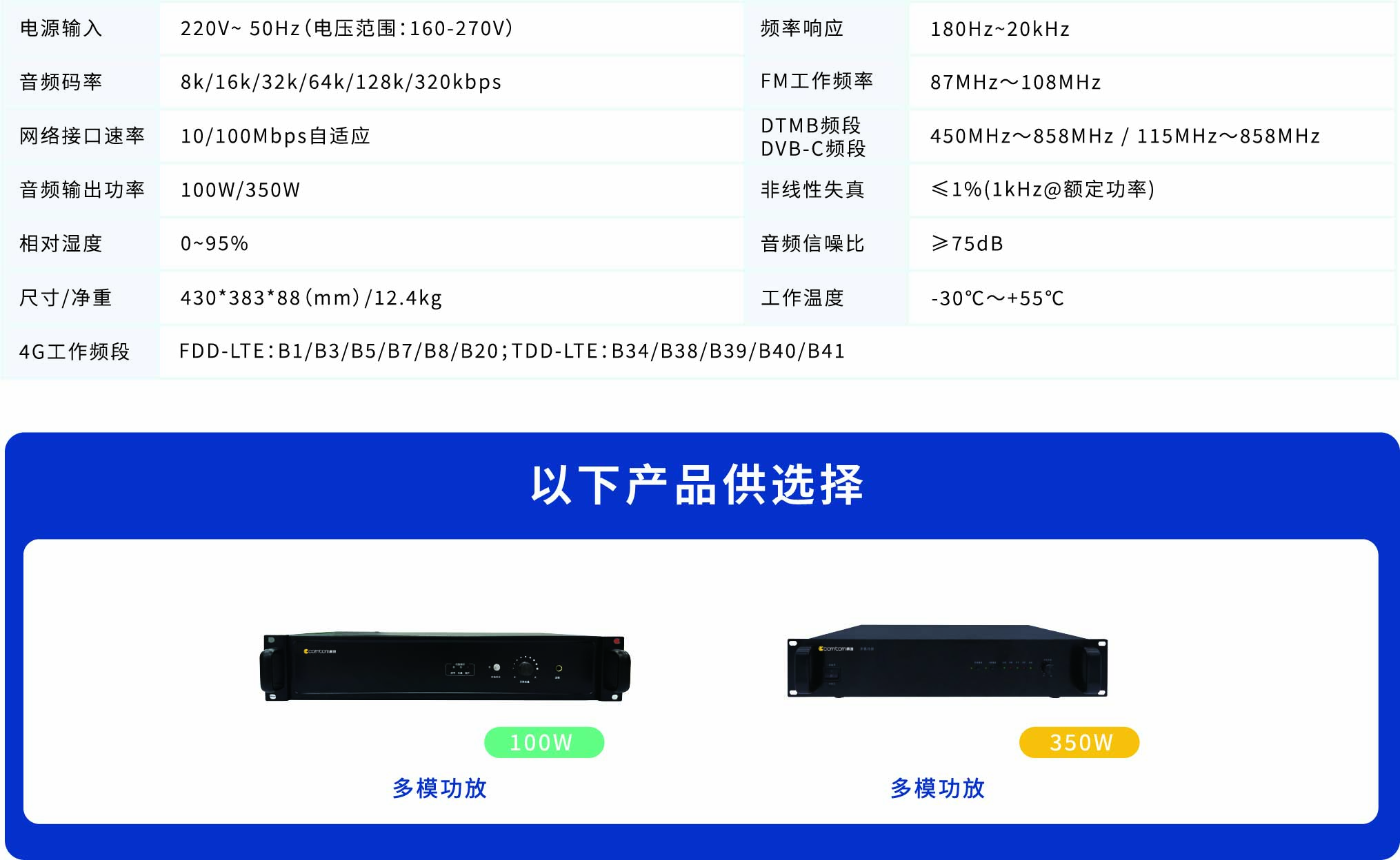 多模功放主要應用于大功率廣播場景,支持接收應急廣播指令并解析其中音頻信號放大輸出至喇叭,同時可進行本地擴聲。整機采用全金屬設計,防腐防潮。產品支持IP 、TS 、 FM 和 4G 四種接收模式(可根據場景,選配模式),可外接高音號角或者模擬音柱等發音單元,輸出功率最高可達350W。