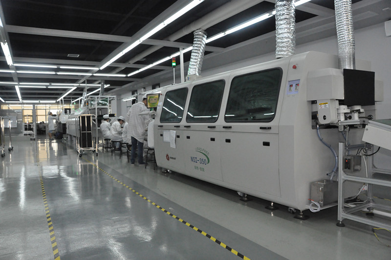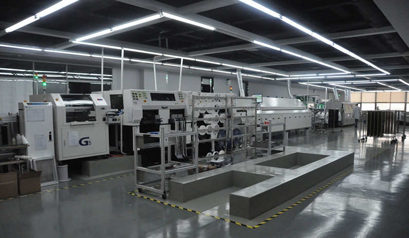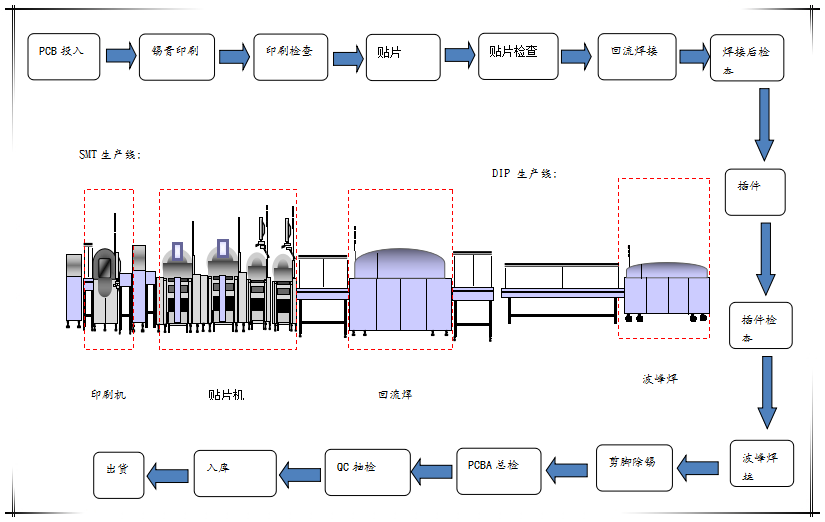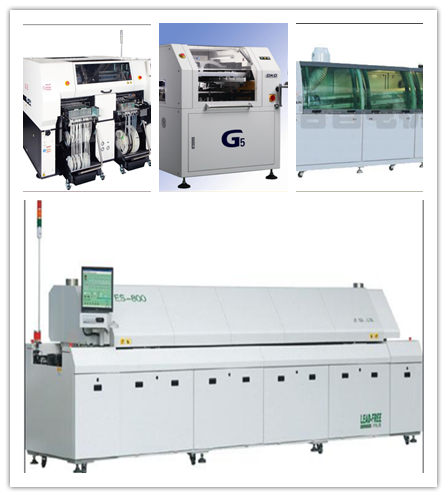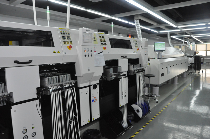 貼片車間生產線目前有1條SMT(表面封裝焊接技術)與DIP(通孔封裝焊接技術)組成。其中SMT設備有全自動上板機1臺,全自動傳送接駁設備3臺,GKG全自動印刷機1臺,Panasonic-AM100高速貼片機2臺,JTE全自動熱風回流焊爐1臺,錫膏攪拌機1臺及全自動烘箱1臺組成;DIP設備有全自動插件線2條,日東全自動波峰焊接爐1臺,全自動出板接駁設備1臺,電容成型機1臺及電阻成型機1臺;周邊輔助設備空壓機1臺,冷干機1臺及風機1臺。